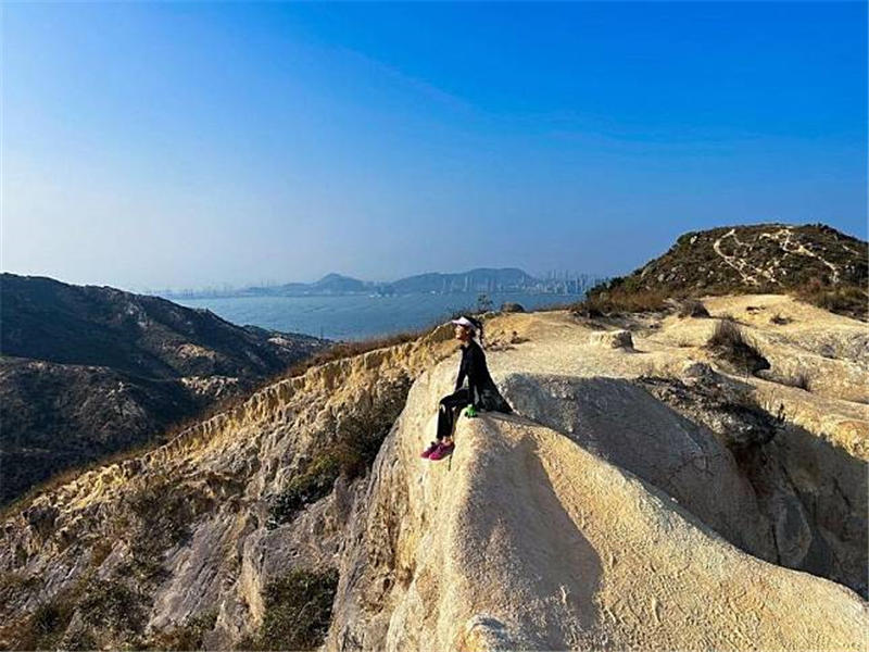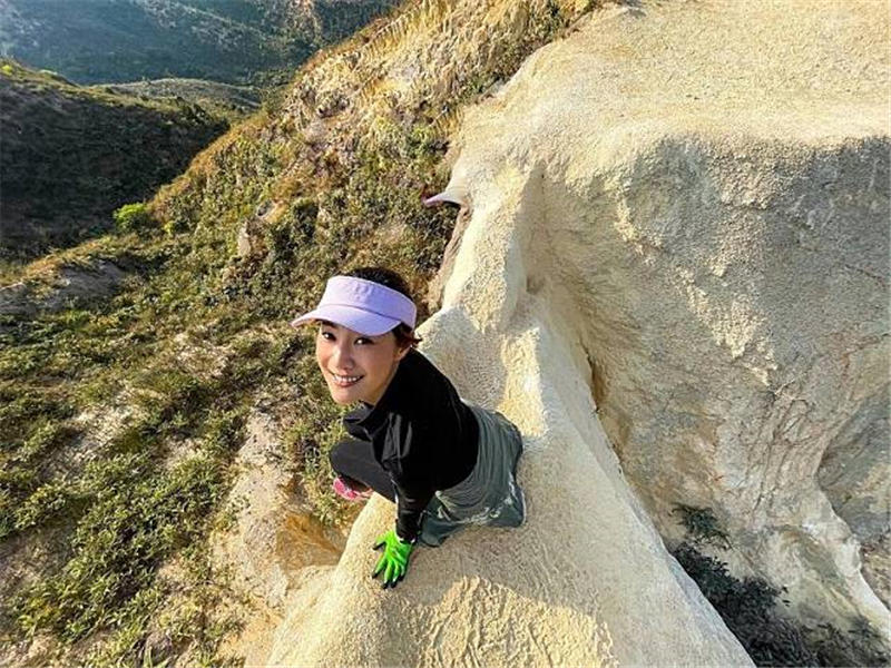 見到朱智賢走過嚴重風化嘅沙石路,其中佢更爬過一線脊,坐喺懸崖邊留倩影,凈係睇相個心都離一離!