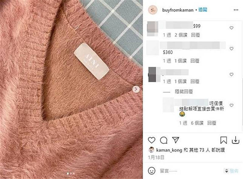 江嘉敏間網店開咗2個禮拜,網民反應未見熱烈,只有小貓兩、三隻出價,其中有一件毛毛冷衫,有網民開價$450競投,其他網民抵死留言話:「呢個價錢點解唔直接去買件新!」