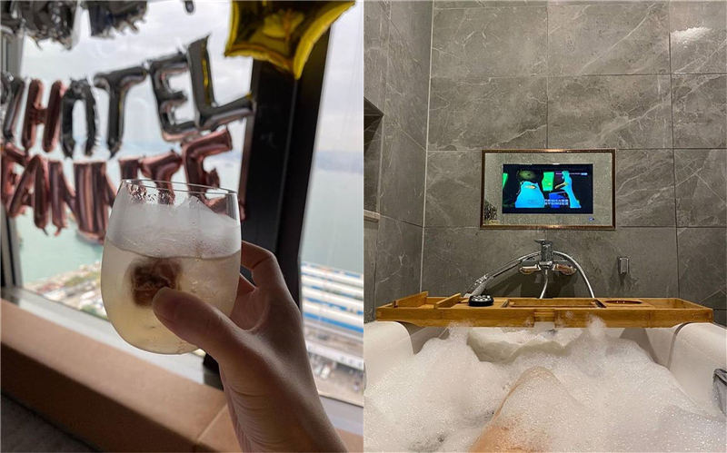 陳瀅留言話:「雖然隔離期間有時覺得鬱悶,但都有啲美好嘅時光,好似我浸泡泡浴、或者酒店員工為我送上Happy Hour靚酒同嘢食嘅時候,都令我心情瞬間開心。」