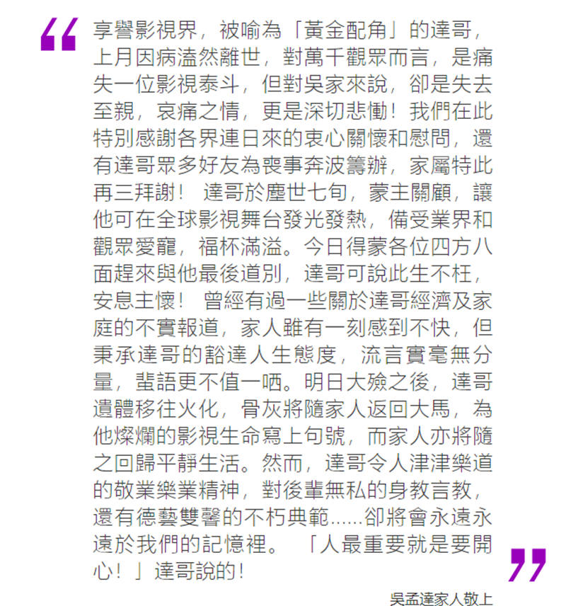 一直低調嘅吳孟達屋企人,佢哋好少接受訪問,今日佢哋向外界發出新聞稿,以“永遠懷念吳孟達(1952-2021)”為題,向眾人表示謝意。