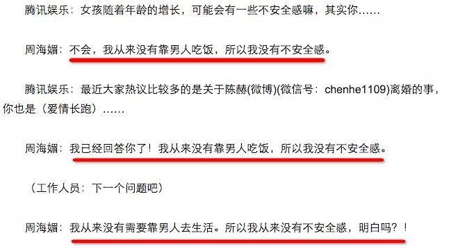 記者接連問咗周海媚三次,佢三次都系一樣的答案:唔會,我從來冇靠男人食飯,所以我唔會冇安全感。