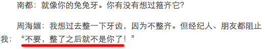 記者曾問佢點解唔去整牙,周海媚話自己都曾想過去整牙,但系被身邊的人勸阻嘞,因為“整咗之后,就唔系你”。