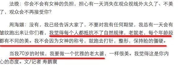 佢話佢都唔會因為女神的稱號,就走去打針、整容,保持面的僵硬,佢話“當我70歲的時候,我要做一個優雅的老太婆。”