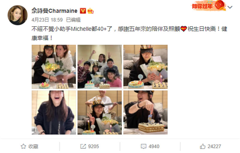 近幾年轉戰大陸娛樂圈嘅前港姐佘詩曼,佢會經常喺社交平臺分享自己嘅動態,吸引大群網民畀Like,呢日佢就喺社交平台曬出為女助手慶祝生日嘅相。