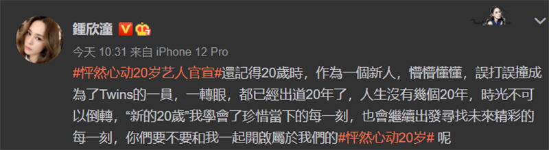而阿嬌今日喺社交平台留言話:「記得20歲嗰陣,作為一個新人,懵懵懂懂,誤打誤撞成為咗Twins嘅一員,轉嚇眼,已經出道廿年,人生冇幾個廿年。」