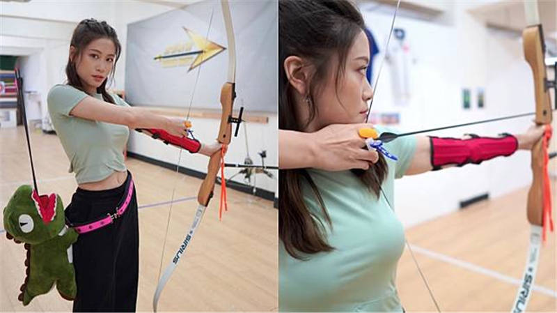 見到林凱恩特別著上緊身運動衫,身材表露無遺,射箭一刻令人窒息,後面身上嘅綠色恐龍公仔造型箭袋,相當可愛。