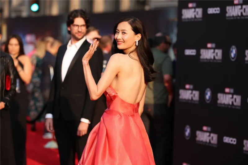 戲中飾演主角尚氣媽咪嘅,以一襲Giorgio amani Prive桃紅色低胸長裙,再襯上頂級珠寶品牌Harry Winston鉆飾現身《尚氣與十環幫傳奇》首映理。