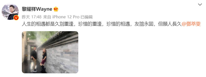 黎耀祥就曬出同鄧萃雯嘅合照,佢話:「人生嘅相遇都係久別重逢,珍惜嘅重逢,珍惜嘅相遇,友誼永固,但愿人長久。」