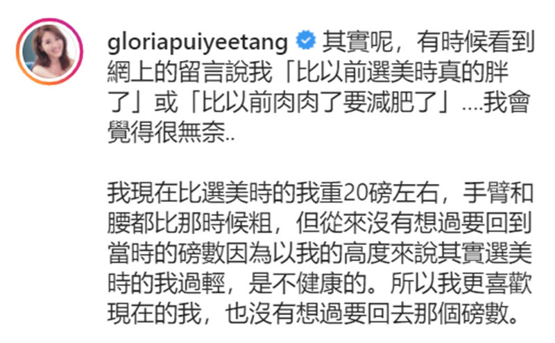 因此鄧佩儀喺佢IG發一篇千字文反擊,鄧佩儀話:「雖然而家我比選美嗰陣重咗20磅左右,但我從來冇諗過要恢復當時嘅磅數,因為以我高度嚟講,其實選美嗰陣我過輕,唔健康嘅,所以我鐘意而家嘅我。」