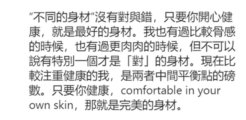 鄧佩儀仲強調話:「只要你開心健康,噉就係完美嘅身材。」