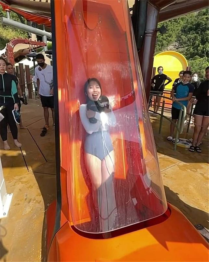 見到陳欣茵到樂園玩水,趁住天氣未算好凍把握機會大曬本錢,見佢著上阿婆內衣泳褲上陣,真係乳出驚人,睇嚟佢完全吾介意展露34D上圍畀粉絲欣賞。