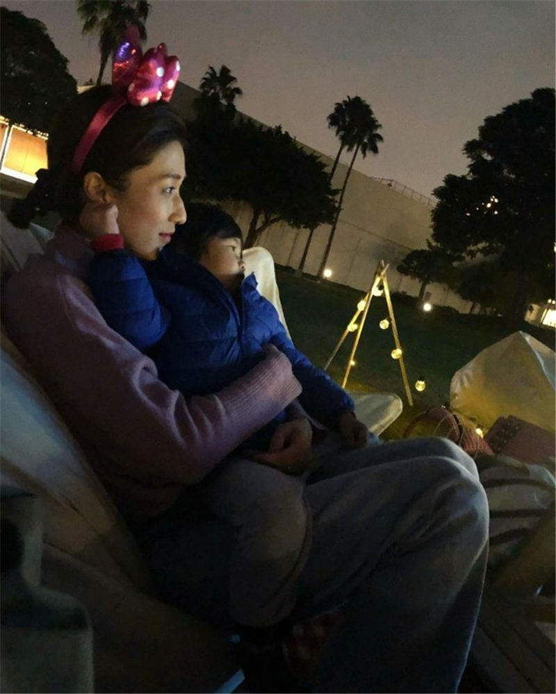 之后,鐘嘉欣同囝囝一齊玩游戲,夜晚又喺酒店嘅露天影院睇卡通電影,相當溫馨。