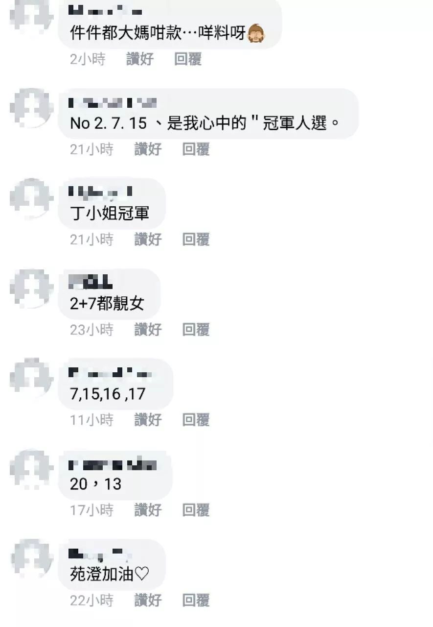 今年佳麗除咗樣貌同學歷平均之外,連身形都相當平均,對比下14號何泳芍(HONEY)身材最為出位,搶盡風頭,難怪被其他佳麗視為勁敵。20個位佳麗唯獨2號莊嘉敏身體抱恙未能出席,有啲美中不足。