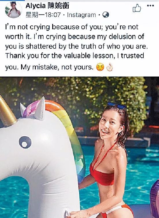 TVB咪神陳婉衡(Alycia)有副靚Body,所以從來唔孤寒,經常喺社交網站狂貼36E火辣身材相,深坑「事業線」、長腿同心型美臀靚圖無限量提供。較早前,Alycia上載一張紅色火辣三點式照兼貼文鬧爆前度因為劈腿而摧毀咗對佢信任,仲話「喊過後,教佢上咗寶貴一課!」咪神形容而家感情現狀系「Very Single」。