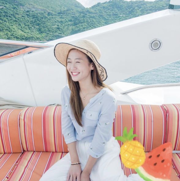 張寶欣清新可人,出海時佢帶住頂大圓邊闊帽,藍色恤衫配搭白色闊腿褲,完全融入大自然之中。