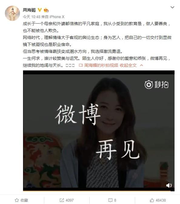經常分享生活點滴的周海媚,連日嚟貼出佛教勸善的短片,兼夾關閉留言評論。佢28號發文,提到自己生長喺佛教家庭,從細到大受教育「做人要善良,也唔可以畀佢人蝦」,面對謾罵留言,選擇激流勇退,決定退出微博,令網友抱不平。