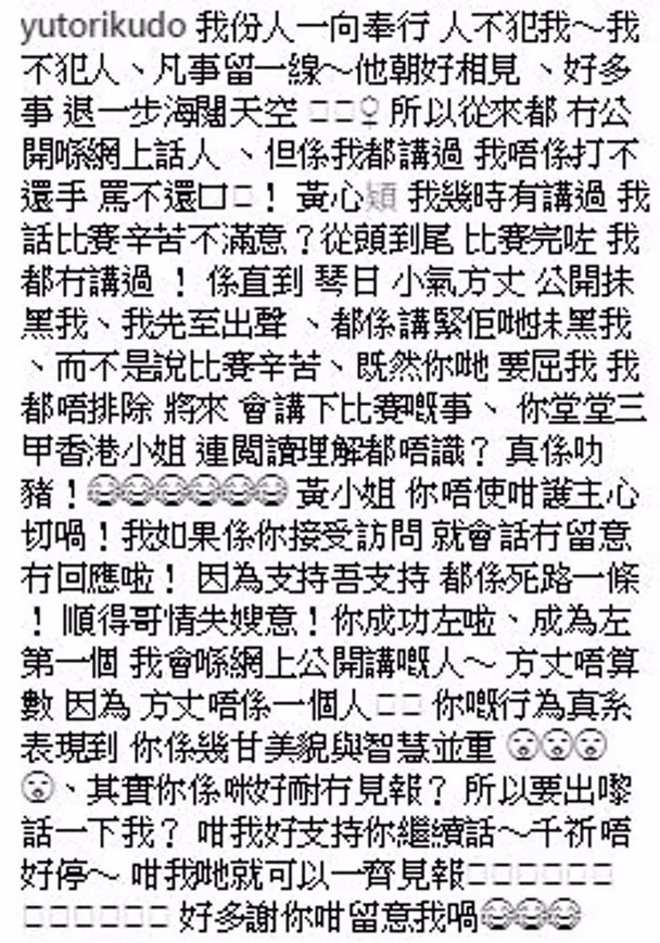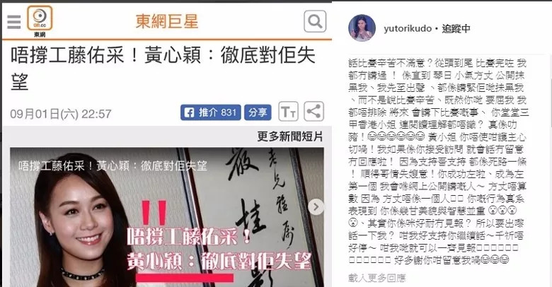 同為港姐出身嘅黃心穎日前被問到呢件事的時候,就好坦白話:「徹底對工藤佑采失望」,認為工藤黑面態度有問題,不料卻成為罵戰觸發點。