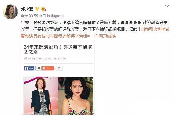 郭少蕓睇到之后喺網上留言:”三更半夜發布噉樣一張相,重畀唔畀人瞓覺呀?”