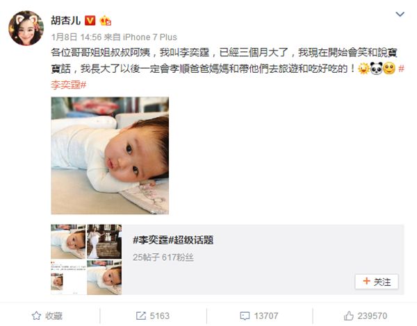呢兩日胡杏兒上熱搜嘞,因為佢首次喺微博上公開咗個仔嘅中文名同正面照