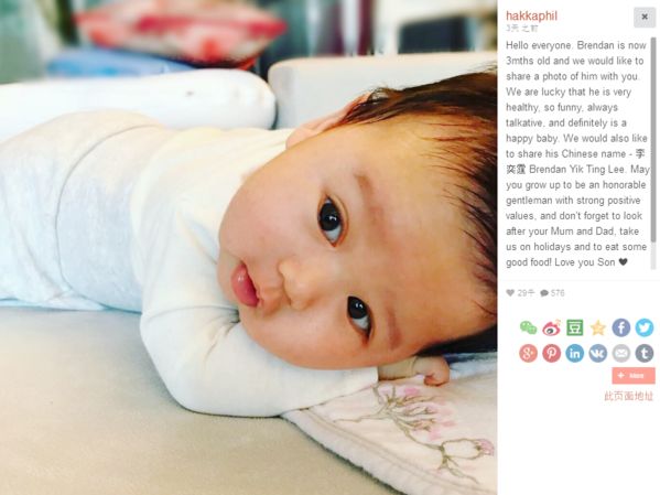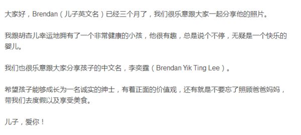 喺相中可以發現,胡杏兒嘅仔李奕霆(Brendan Lee)同阿媽一樣有住深深嘅雙眼皮,仔碌碌大眼空靈閃動,面肉憨憨、紅撲撲嘅,萌到靚女!