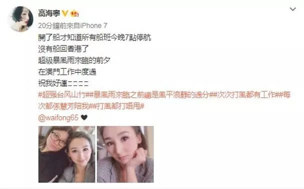 高海寧仲舉勝利V手勢擺Pose,又留言謂:「祝我好運,我仲笑得出,次次打風都有工作,次次都系慧芳陪我,打風都打唔掉。」雖然女神表現輕松,不過喺啲噉惡劣的天氣下,仲系令唔少粉絲網友擔心,紛紛叮囑女神要萬事小心,記得留起安全的地方避風。
